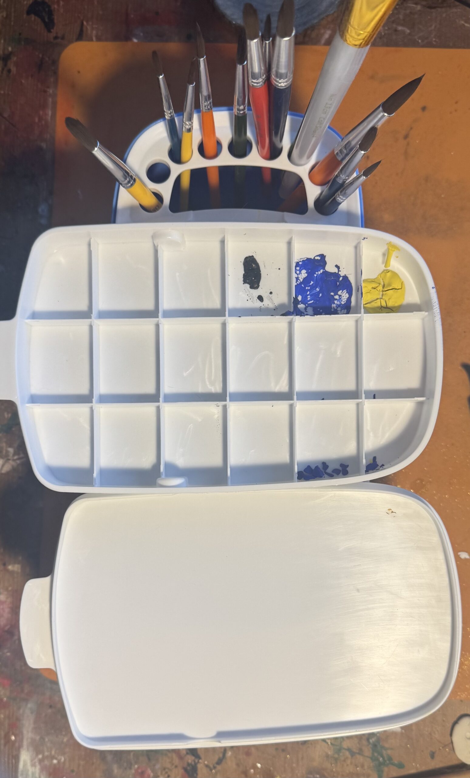 It also comes with a lid that doubles as a paint palette. The palette has small wells for holding your paints, which is surprisingly useful. You can squeeze out your colors and keep them from bleeding together. Before I got this, I was putting paint on random cardboard, old flyers, or whatever was nearby. The colors would sometimes run into each other, so the wells are definitely an improvement.